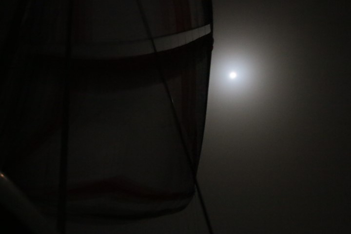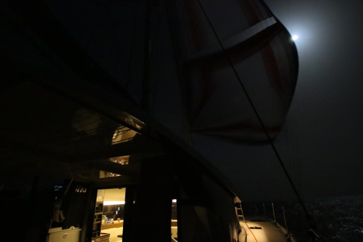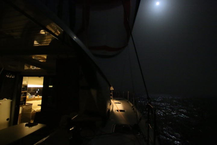 Michèle erscheint zum Mittagsort. Und bietet an, beim Para-Setzen zu helfen. So was lasse ich mir nicht zweimal sagen. Also noch die paar Minuten gewartet, bis der Mittagsort gemacht werden kann und dann ziehen wir den Para hoch. Es ist einfach ein friedliches Segeln mit dem Ding! Der Autopilot muss nicht so viel tun, die Geschwindigkeit ist bei den schwachen Winden um 10 kn dann doch mit 5 kn Fahrt höher als mit Doppelfock und Groß. Das hatte ich übrigens das erste Mal. Hat funktioniert…..