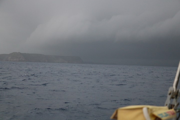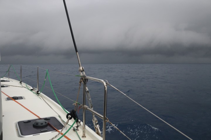 Nebenbei: Die Regenfront zieht eher schneller weg als RE hinterher fährt. Also – eigentlich wäre es nicht schlecht, wenn wir einmal ordentlich „abgewaschen“ werden! So ne halbe Stunde heftiger Regen und der Dreck (Saharastaub auch in den Leinen und am Mast) und das Salz des Atlantiks (überall!) wären gut weg! Aber so gut meint es Petrus nicht mit uns!