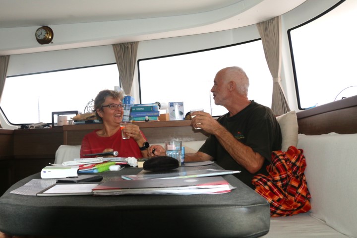 Anker geworfen, notdürftig seeklar zurück und: Nun bestehe ich auf ein Gläschen Sekt! Dritte Atlantik-Querung ohne Schäden hinter uns gebracht! Brave RE! Prost!