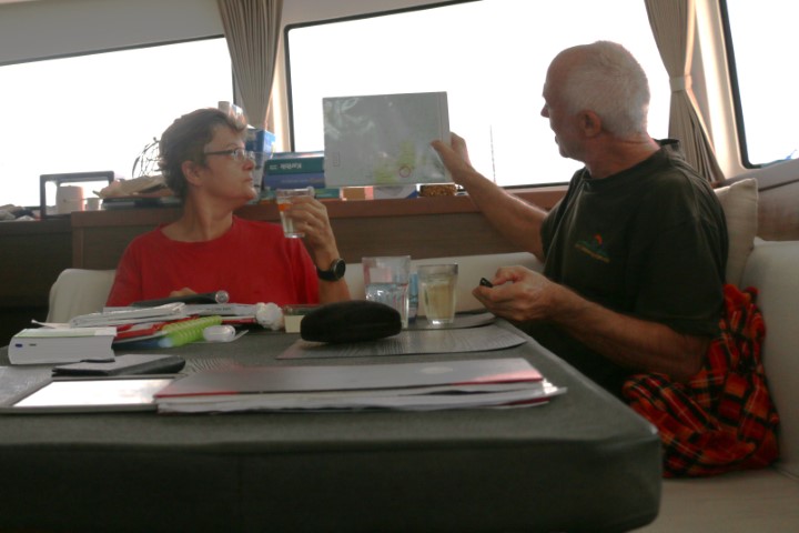 Michèle ist durch die Motoren geweckt worden und darf nun mitbestimmen, wo wir den Anker werfen. Zwei Boote liegen schon vor dem Hafen. Da bleibt nicht viel übrig.
