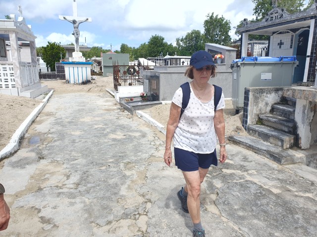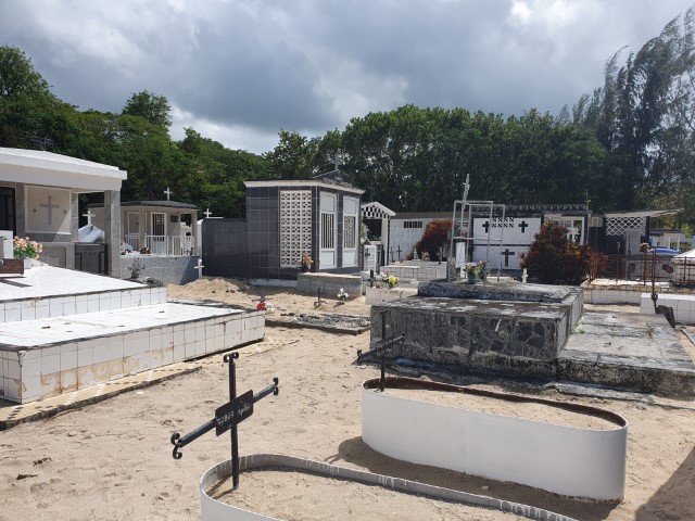 Morgens war für mich noch Werkstatt trocknen angesagt, doch dann kommt der Einsatzbefehl: Wir wandern heute an der Küste nordwärts! Warum auch nicht. Am Ende von Port Louis ist großer Badestrand-Betrieb. Anschließend kommt der Friedhof – immer wieder gerne besuchen wir so etwas. Doch der hier kommt nicht annähernd an „unseren“ Friedhof in Morne-à-l'Eau heran.