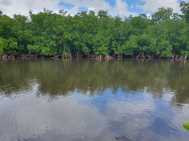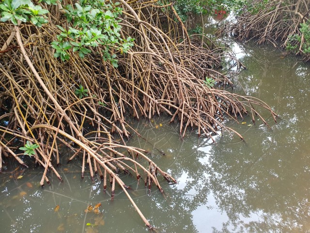 Ein paar Schritt weiter führt dann eine Holzbrücke in den Mangroven-Wald. Hier können wir Monika mit vielen von den Informationen füttern, die wir damals auf unserer Mangroven-Ausflug gelernt haben.
