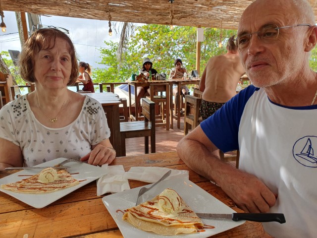 Wieder zurück beim Badestrand gönnen wir uns eine Stärkungs-Pause im ersten Stockwerk eines netten Strand-Cafés. Ein Kellner trägt ein Crepe mit einem Ballen Eis vorbei. Whow! Das wollen wir auch – und bekommen es auch! Hmmmm!