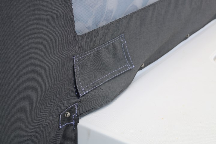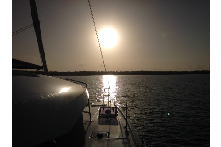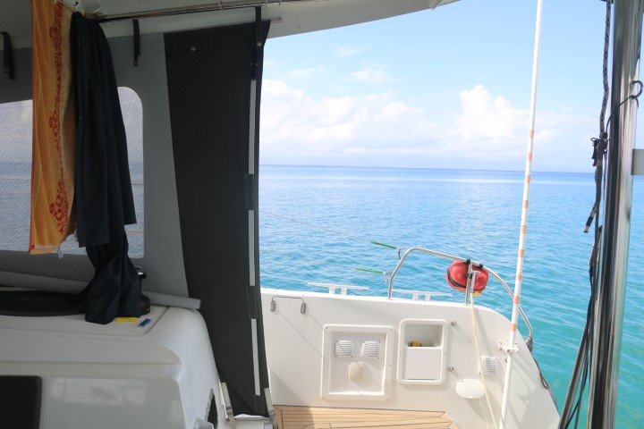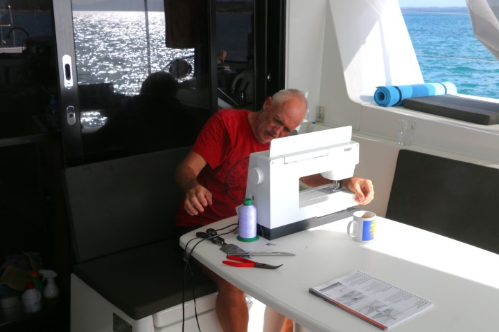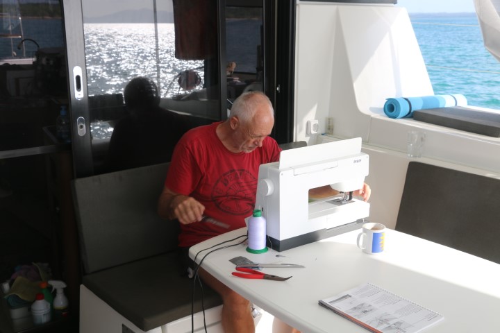 Ruhetag! Michèle schwimmt eine große Runde. Monika eine kleine (vier mal ums Schiff ist heute Ziel!) Und ich „darf“ nähen. Neben Kleinigkeiten bekommt die Steuerbord-Persenning eine Segellatte, einen Verschluss des neuen Durchbruchs für die Leinen, die auf die Winsch gehen. Und eine Verstärkung an einer Ecke, an der es den Knopf raus gerissen hat. Was sich hier so läppisch anhört kostet am Ende 5 Stunden Arbeit. Das fängt ja an, die Nähmaschine aus der Last raus zu operieren. Und hört dann auf, die wieder zu verstauen. Meine Uschi Bracht wäre bestimmt nicht zufrieden mit mir, nicht nur, dass die Nähte weit weg von „gerade“ sind, nein, die Unterspannung des Fadens bekomme ich auch auf stärkster Stufe nicht stramm genug. Und dann gibt es schon mal „lose Enden“… Aber am Ende sage ich: Es wird eine Zeitlang halten, es erfüllt seinen Zweck und es ist getan. Hier einen Segelmacher zu finden, der das erledigen könnte, das vergessen wir mal lieber.