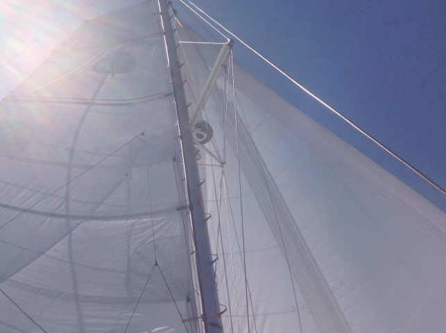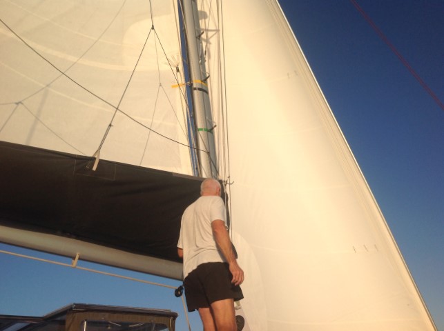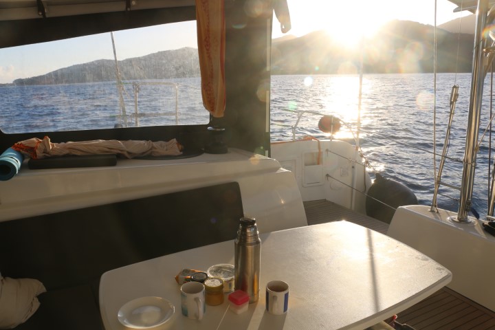 Morgens geht es früh los: Um 6 Uhr erwache ich und beginne mit seeklar machen. Viel haben wir gestern Abend schon erledigt. Heute noch Logbuch, Navigationselektronik klar machen und Groß vorheißen. Beim Ankeraufnehmen kommen die beiden Mädels an Oberdeck: Klar, das macht Krach, den man nicht überhören kann…