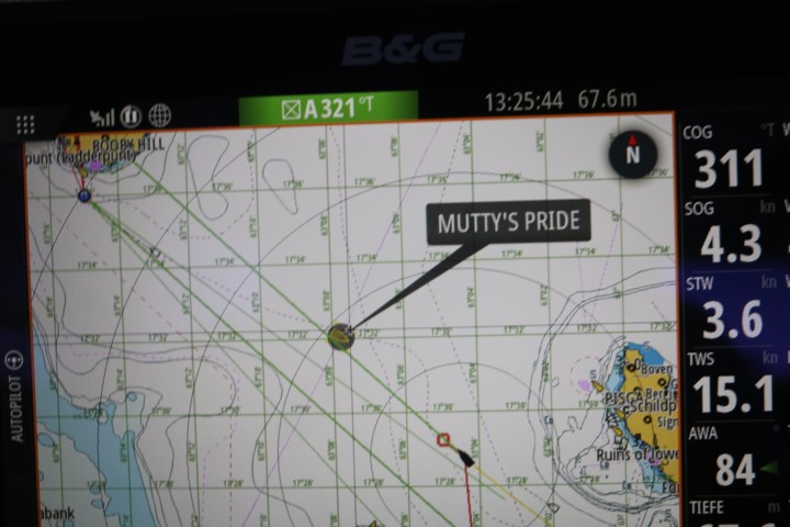 Aber alles funktioniert wunderbar und um viertel vor fünf – jetzt natürlich nachmittags, machen wir an einer Super-Mooring fest. Für die Nicht-Seeleute: Eine Mooring ist ein dicker Betonklotz mit einer Kette oder einem Seil an die Oberfläche, wo dann eine Boje daran befestigt ist. Diese nimmt man auf und macht dann das Seil an Bord fest. Das erspart den Anker. Und bietet Sicherheit schon bei viel kürzerer Entfernung zum Betonklotz. In der Regel: 10 Meter zum Betonklotz ist wie 50 Meter zum Anker. Denn nicht der Anker hält ein Schiff, sondern die Kette! Damit erreicht man dann auch, dass auf einer engen Fläche viel mehr Boote an Moorings fest machen können, als wenn jeder sein Anker wirft.