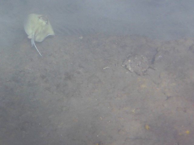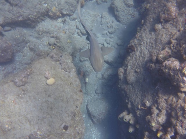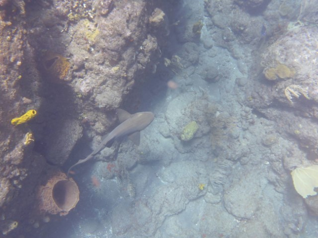 So richtig glasklar ist das Wasser hier aber auch nicht. Das sah auf der Herfahrt viel besser aus. So nehmen wir die Vorleine und schleppen das Dinghy hinter uns her – am Ende bis zu RE. Mehrere Rochen werden dann auch „auf Celluloide“ gebannt. Und dann das echte Highlight. Ich bin gerade unten, als Mic von oben her „oje, oje oje“ macht. Wild zeigt sie nach links. Whow – ein (kleiner) Hai wuselt auf mich zu. So in der Meterklasse. Shit, ich bin am Ende meiner Luft, also hoch. Aber er bleibt unter uns und ich kann noch mal runter, das muss doch gefilmt werden!