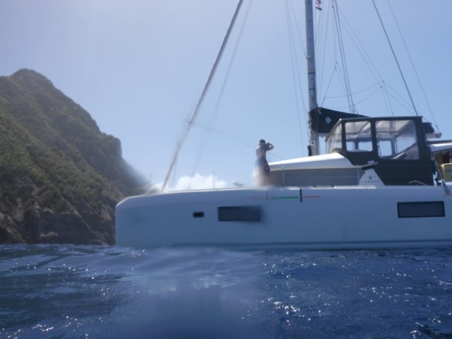 Kaum auf RE angekommen, werfen wir uns los von der Mooring und ziehen Segel hoch. Es war ziemlich wenig Wind vorhergesagt. So war dann schon motoren eingeplant. Die Segel bringen mit Motorunterstützung teils mehr als 6 Knoten. So kommen wir sicher im Hellen nach Marigot, St. Martin.