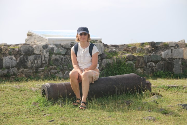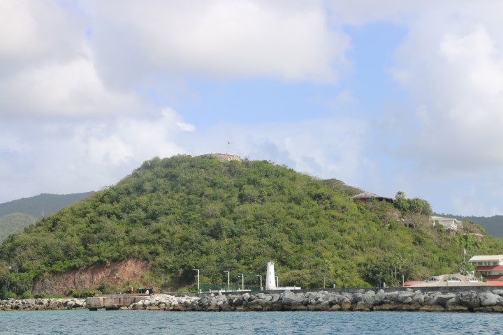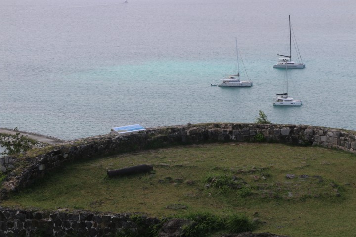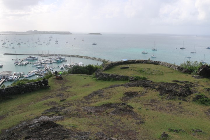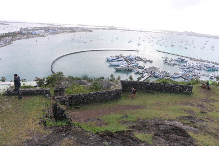 Nach dem Wäsche-Aufhängen schießen wir gleich wieder an Land: Das Fort besichtigen und einen Kaffee trinken. (Zum alten Bericht: 2022 04 13 Fort de Marigot.) Im Fort gibt es dann wieder mal einen Regenschauer, das mit dem Cafe-Besuch wird ein Reinfall. Die offenen Cafes sind alle an der Straße, die „netten“ alle zu. So beschließt Michèle: Ab nach Hause, da gibt es guten Kaffee und Ruhe!