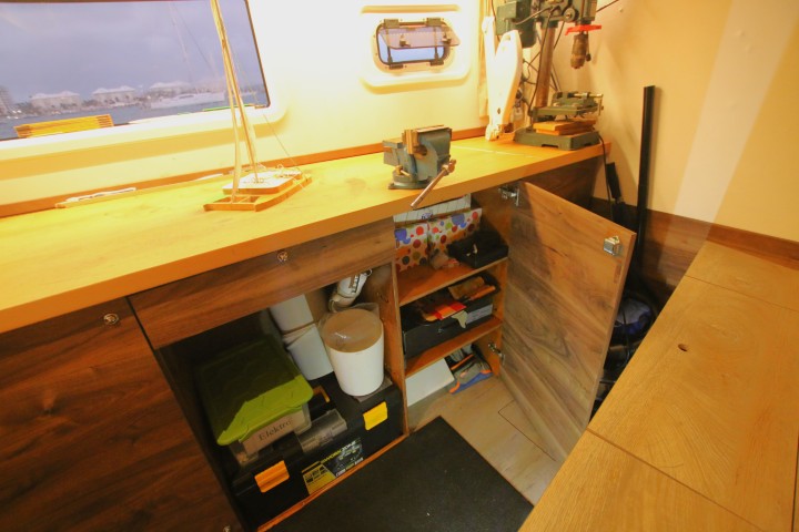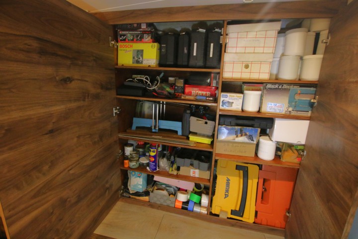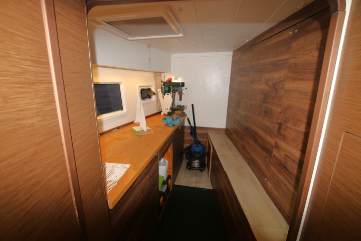- vordere Sanitärbereich ist Stauraum mit 5 großen Regalbrettern. Diese können platzsparend unter dem Dach so gestaut werden, dass der Sanitärraum wieder in Betrieb gehen kann, wenn eine 3. Kabine benötigt wird.